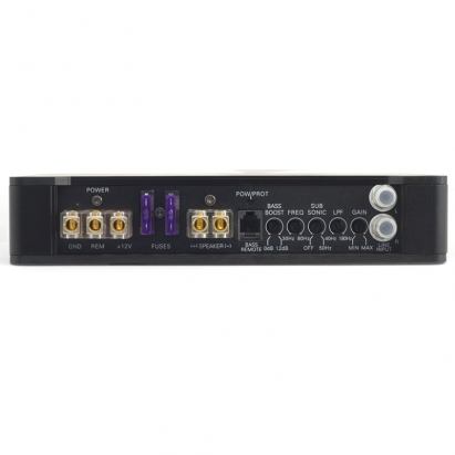 В дополнение к стандартному регулятору, вы получите 40-180 Гц НЧ-кроссовер, переменной частоты инфразвуковой фильтр Subsonic и контроль EQ до 12 дБ усиления низких частот при в диапазоне от 30 до 80 Гц. Подключение динамика обеспечивают защищенные клеммы для плюсового и отрицательных проводов. Также на этой панели находятся два 35 амперных предохранителя, RCA входы и сигнальные выход для ДУ.