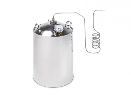 В комплектацию входит: перегонный куб на 20 литров, гайка с внутренней резьбой, трубка для отвода пара со змеевиком, термометр.