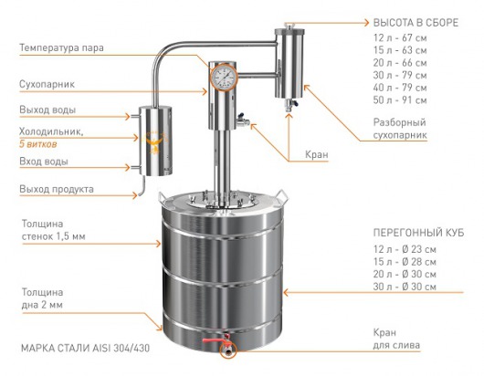 Перегонный куб аппарата изготовлен из пищевой нержавеющей стали марки AISI 304/430 с толщиной стенки 1,5 мм, что обеспечивает долгий срок службы изделия. Из этой же стали изготавливается и змеевик аппарата, соответствующий классической схеме из пяти спиральных витков.
