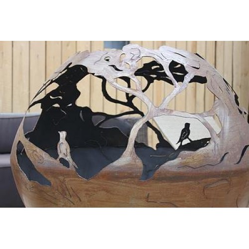 Эта костровая чаша является самым смелым и изысканным решением во всей серии очагов от FireCup. Переплетение филигранно выполненных орнаментов, охватывает всю чашу, образуя шар в форме раскидистой кроны дерева. По бокам этой сказочной конструкции можно увидеть несколько фигурок соловьев, но все остальное – это металлический лес.