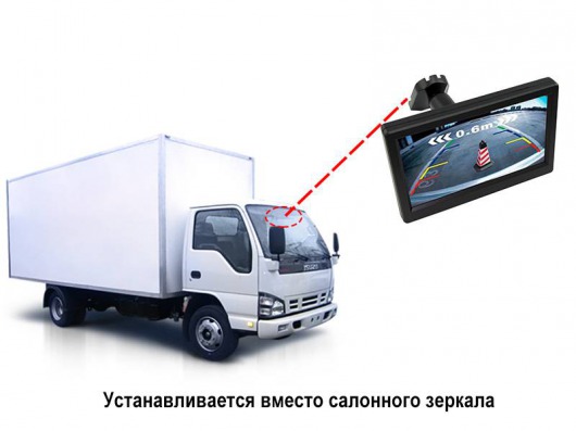 Пакровочный 5" монитор высокого разрешения для грузовых автомобилей. Изображение на экране видно в любой самый солнечный день благодаря высокой яркости. Встроенный датчик света автоматически регулирует яркость экрана исходя от внешней освещенности. Монитор имеет штатный крепеж и устанавливается на оригинальный крепёж на стекло автомобиля. Для установки требуется демонтаж штатного зеркала. При включении задней передачи на экран зеркала автоматически выводится изображение с камеры заднего вида, а дополнительный видеовход позволит подключить боковую или переднюю камеру. Яркость и контрастность картинки можно отрегулировать с помощью кнопок на задней части монитора. Корпус зеркала повторяет дизайн оригинального зеркала.