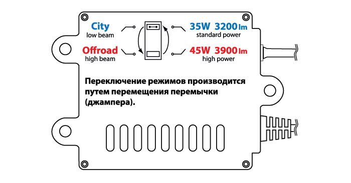 Система Energy Charger дает возможность увеличивать яркость свечения лампы с 3200 лм до 3900 лм, путем изменения выходной мощности с 35 Вт до 45 Вт. Эта опция позволяет использовать один и тот же блок для режимов City 35 Вт 3200 лм и OffRoad 45 Вт 3900 лм.