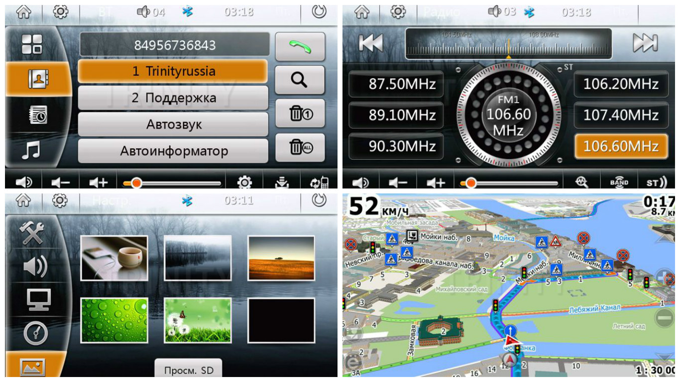 Мультимедийный плеер штатного головного устройства с навигацией Trinity поддерживает большинство форматов файлов. Поэтому выбранный вами диск обязательно будет читаться. Кроме того, штатная голова Trinity оснащена USB и SD-входом. Так что вы легко можете подключить к штатной магнитоле любую флэш-карту и смотреть/слушать любые файлы.