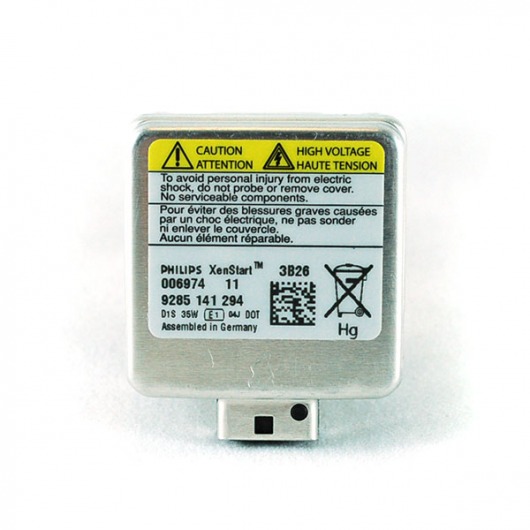 Лампа ксенона Philips D1S представляет собой колбу, в основании которой размещена небольшая металлическая коробочка. Эта коробочка называется игнитором, т.е. преобразователем напряжения. Благодаря тому, что игнитор разместился не в блоке розжига, а в лампочке, уменьшились помехи в электрике автомобиля. Некоторые называют эту модель "лампочкой со встроенным блоком". Но не путайте! Блок розжига лампы помещается в фару!