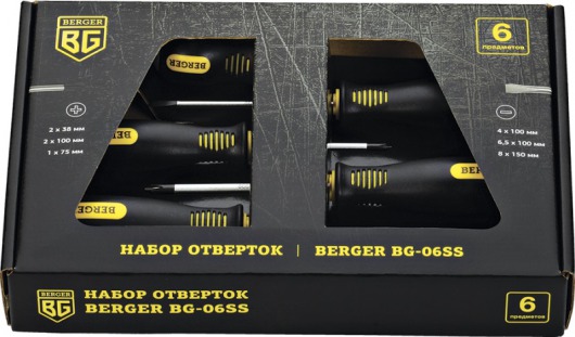 BERGER BG-06SS — это универсальный набор из 6-ти отверток с крестовыми наконечниками РН (Phillips) и прямыми наконечниками SLOT (шлиц). Отвертки изготовлены их прочной никель-хром-молибденовой стали марки AISI 8660, благодаря чему инструменты выдерживают продолжительные интенсивные нагрузки. А удобные резиновые рукоятки не скользят и абсолютно не деформируются при использовании.
