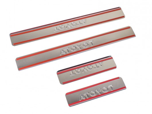 Накладки на металлические пороги дверей Toyota Corolla с логотипом авто не только обеспечивают защиту верхней и боковой поверхности внутреннего порога, но и отлично вписываются в интерьер автомобиля, подчеркивая его стиль и индивидуальность. C монтажом проблем не возникнет: установка накладок на внутренний порог для Тойота Королла производится на штатные места с помощью скотча 3M.
