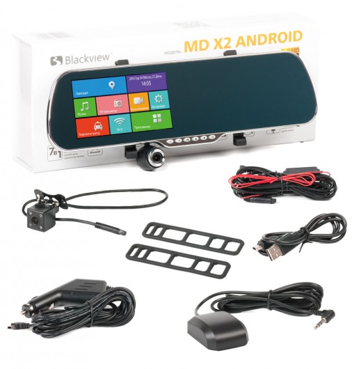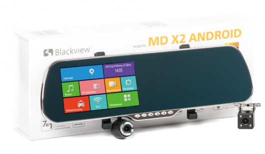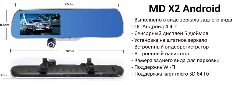 MD X2 Android - модель представляет из себя видеорегистратор вы корпусе салонного зеркала с экраном, в комплекте дополнительно идет выносная камера. Зеркало-видеорегистратор  имеет ряд отличительных особенностей: большой и яркий пятидюймовый сенсорный дисплей, встроенный навигатор, поддержка wi-fi связи, встроенный МР4 плеер, GPS-модуль, выносная камера с парковочными линиями и прочее. Видеорегистратор оснащен встроенным процессором Allwinner A33 quadcore, обеспечивающим надежную работу устройства.