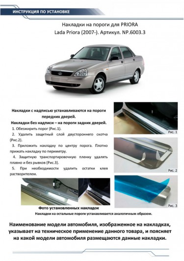 Данные накладки на внутренние пороги «Риваль» разработаны специально для автомобилей Lada Priora от 2007 г.в. и полностью повторяют их геометрию. Кроме того, накладки порогов двери Rival очень легко и быстро устанавливаются. И при этом надежно крепятся за счет плотного прилегания морозостойкого скотча.