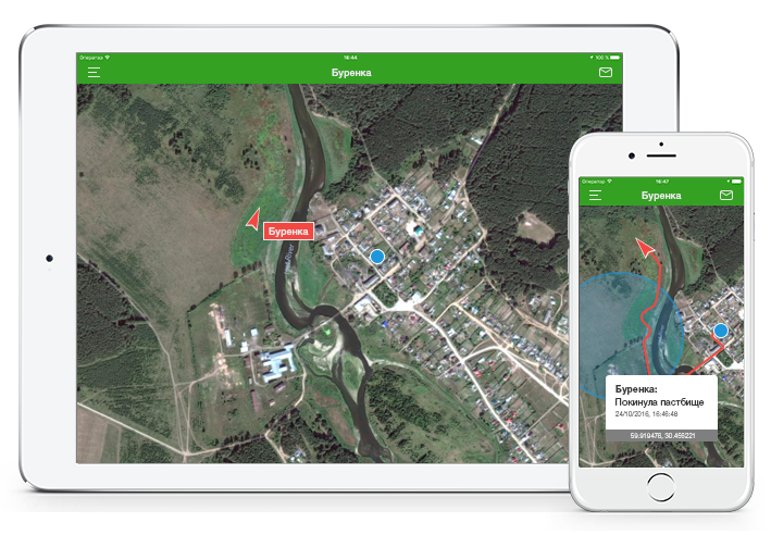 Через сервис мониторинга видно местоположение животного с точностью до 5 метров, а также показывается точка в которой находитесь вы. С резервной геолокацией LBS сигнал остается стабильным, даже если парнокопытное спряталось среди часто посаженных деревьев.