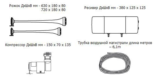 Комплект KIT 2009 — это ярковыраженный бас на службе Вашего автомобиля. Вы можете разместить устройство под капотом или снаружи автомобиля на свое усмотрение. Основные запчасти можно расположить в разных частях машины: рожок, конечно же, ставится в передней части машины, а вот ресивер и компрессор — в багажнике либо салоне (если нет места в моторном отсеке).