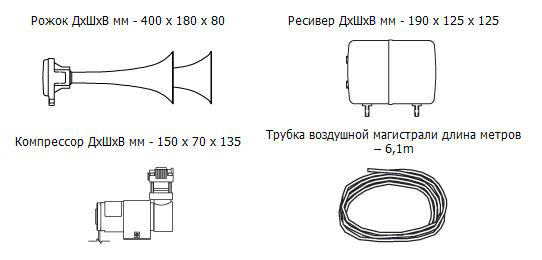 Комплект KIT 964 это ярковыраженный бас на службе Вашего автомобиля. Вы можете разместить устройство под капотом или снаружи автомобиля на свое усмотрение. Основные запчасти можно расположить в разных частях машины: рожок, конечно же, ставится в передней части машины, а вот ресивер и компрессор — в багажнике либо салоне (если нет места в моторном отсеке).
