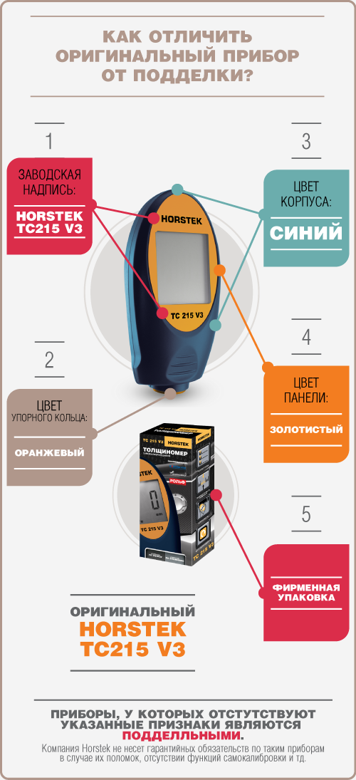 Внимание! Подделки! На рынке появились поддельные приборы, которые позиционируются как Horstek TC 215 V3 или его аналоги. Часто они продаются по заниженным ценам. В этих приборах отстутствует функция самокалибровки, упорное кольцо сделано из металла или дешевого пластика.