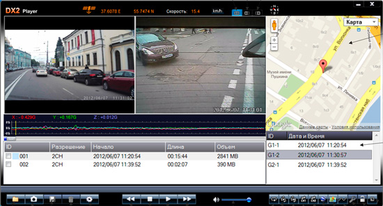 Одно из главных преимуществ гаджета - это внешний GPS-модуль. Он вычисляет точные координаты автомобиля, к тому же, если Вы попали в ДТП, покажет смещение Вашей машины в пространстве. А с помощью карт Goole можно даже изучить маршрут транспортного средства!