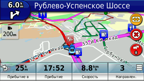 Интересная функция - голосовые подсказки. Устройство указывает Вам на повороты, приближение перекрестков и названия улиц. В то же время оно реагирует на Ваши голосовые команды, поэтому управляйте навигатором, не отрываясь от вождения!  Команды - это те опции, которые отображаются на дисплее.