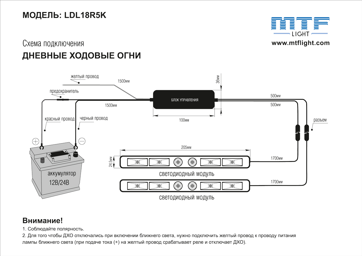 Благодаря специальному датчику, огни загораются, как только Вы поворачиваете ключ зажигания. А когда Вы включаете ближний свет или габаритную подсветку, светодиоды LDL18R5K автоматически перестают работать. Уникальный встроенный микрочип контролирует работу огней в зависимости от того, включен двигатель или нет.