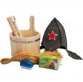 Набор для бани "Доспехи" из 6 предметов: ушат 5л, щетка с пемзой, мочало лыковое, запарка, часы песочные, шапка "Буденовка"